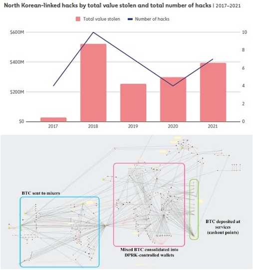 이 회사에 따르면 북한의 해커들은 2021년 일곱 번에 걸쳐 가상화폐 거래소와 투자 회사에 침투해 4억 달러(4700억 원) 규모의 가상화폐를 훔쳤다.