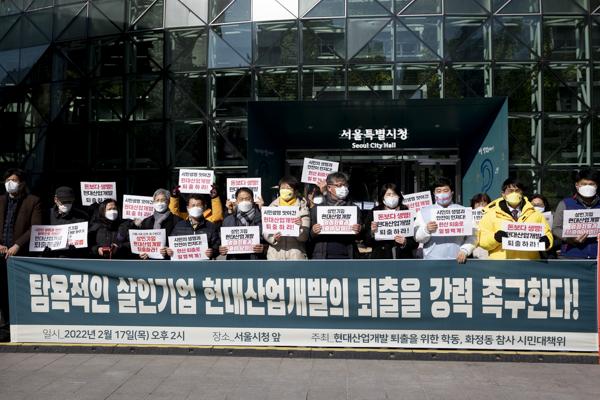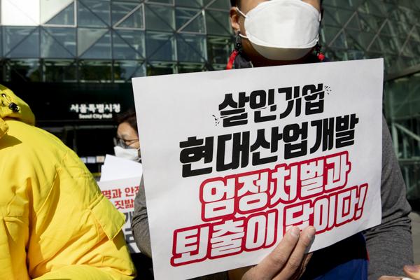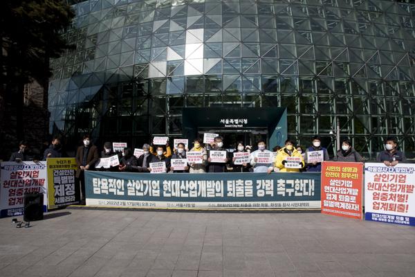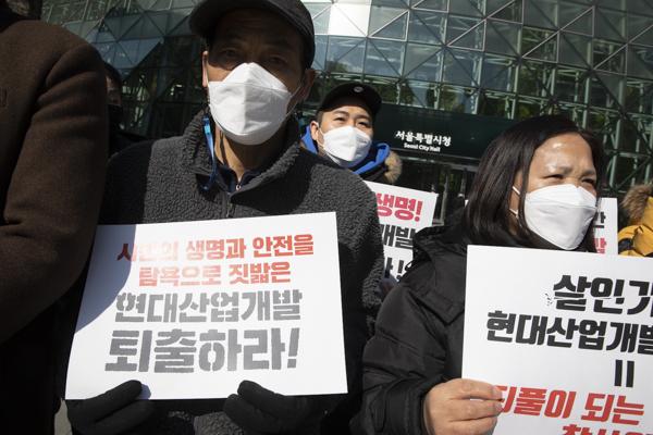 현대산업개발 퇴출 및 학동·화정동 참사 시민대책위가 17일 서울시청 앞에서 '현대산업개발(현산) 퇴출을 위한 서울시 청문회 항의 상경 투쟁' 기자회견을 하고 있다. 이날 서울시는 본청에서 현산 및 서울시 관계자, 외부 주재 위원 참석하에 청문회를 진행한다.