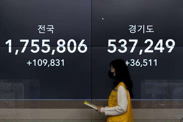 코로나19 신규 확진자가 10만 명을 넘어선 18일 경기 성남시청 재난안전상황실 모니터에 표시된 확진자 수. 이날 0시 기준 신규 확진자는 10만9831명으로 집계됐다.
