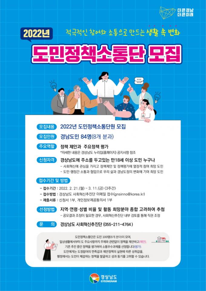 '도민정책 소통단'은 전체 100명(8개 분과)으로 구성된다. 이번 공개모집에서 84명을 선발하고, 나머지 인원은 경남도에서 추천한다.