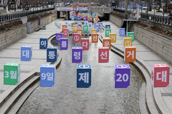 20대 대통령선거가 코앞이다. 2주만 지나면 새 대통령이 선출된다. 21일 서울 청계천에 선거 투표를 독려하는 홍보 조형물이 특색있게 설치돼 있다.