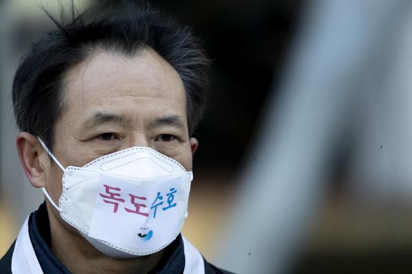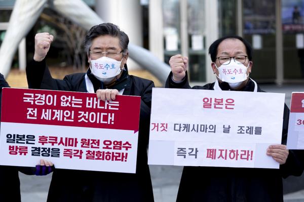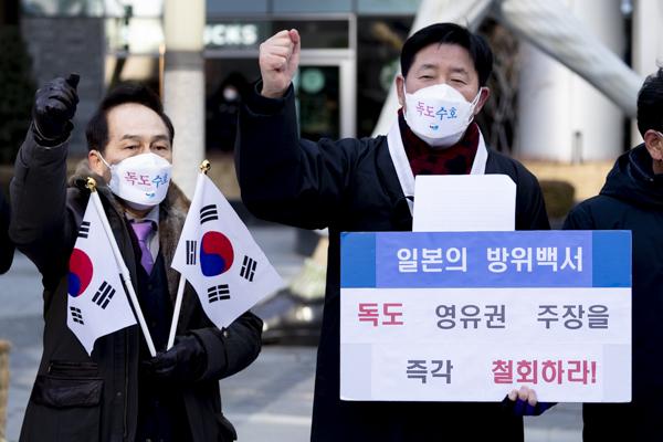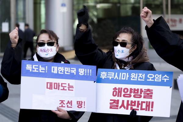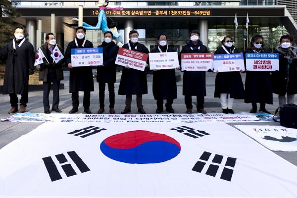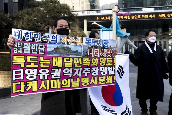독도향우회 회원들이 22일 서울 종로구 연합뉴스 앞에서 '일본의 독도 시마네현 편입과 다케시마의 날 조례 규탄' 집회를 하고 있다.