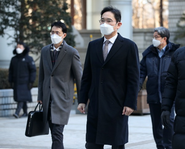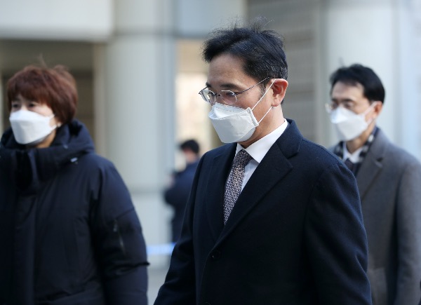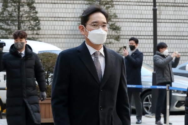 이재용 삼성전자 부회장이 24일 서울중앙지방법원에서 열리는 '회계 부정·부당 합병' 관련 1심 속행 공판에 출석하기 위해 법정으로 향하고 있다. [사진공동취재단]