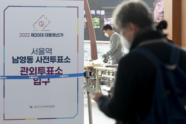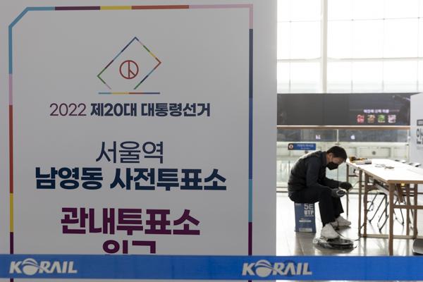 제20대 대통령 선거 사전투표를 일주일 앞둔 25일 서울역에서 관계자들이 '남영동 사전투표소' 설치 작업을 하고 있다. 이번 대선 사전 투표는 오는 4~5일로 전국에 설치된 사전투표소에서 오전 6시부터 오후 6시까지 할 수 있다. 본 투표일은 3월9일이다.