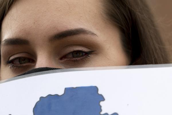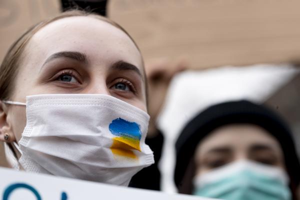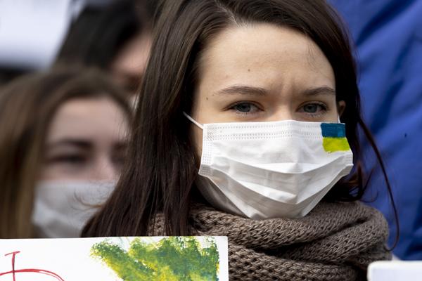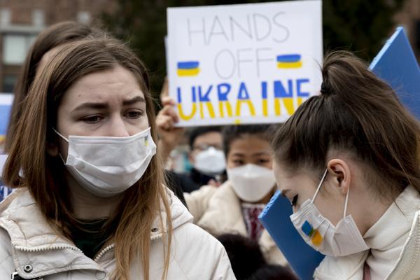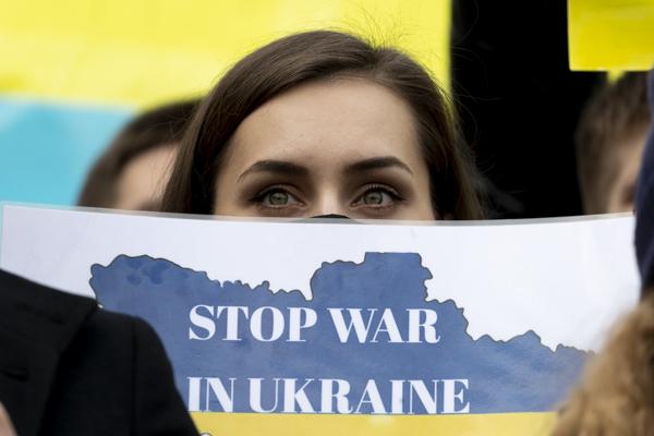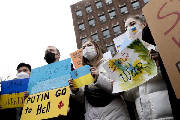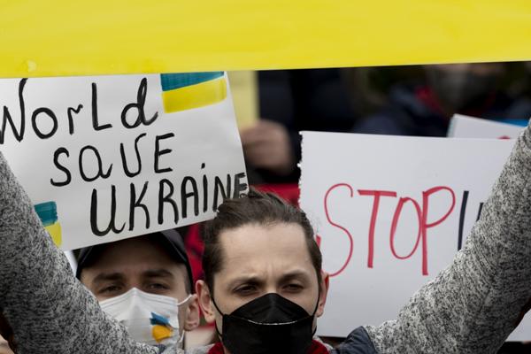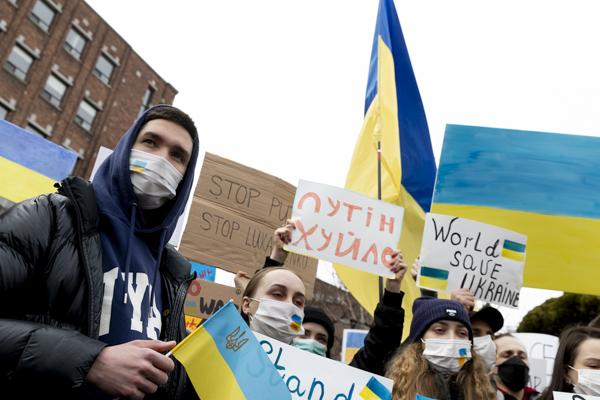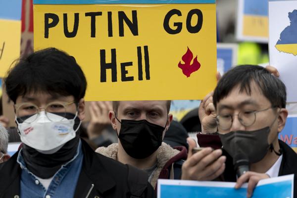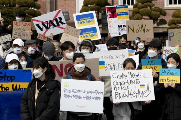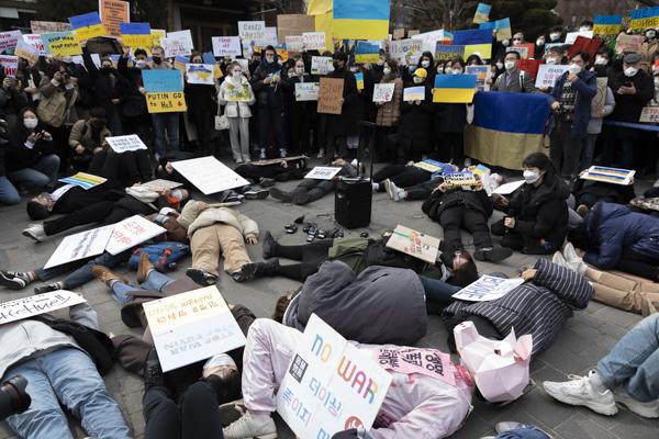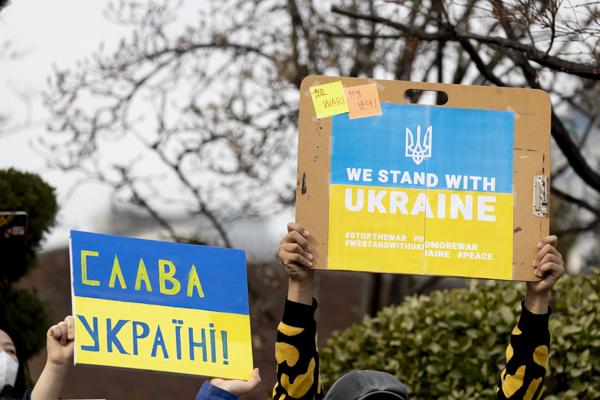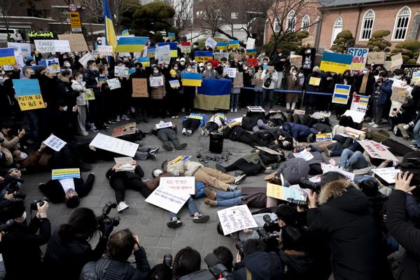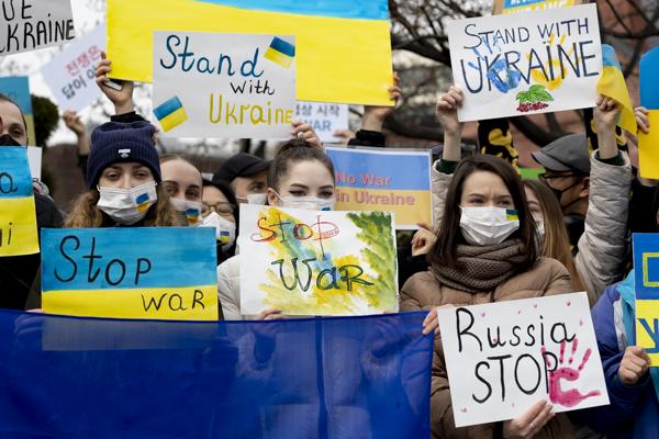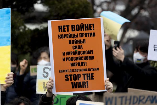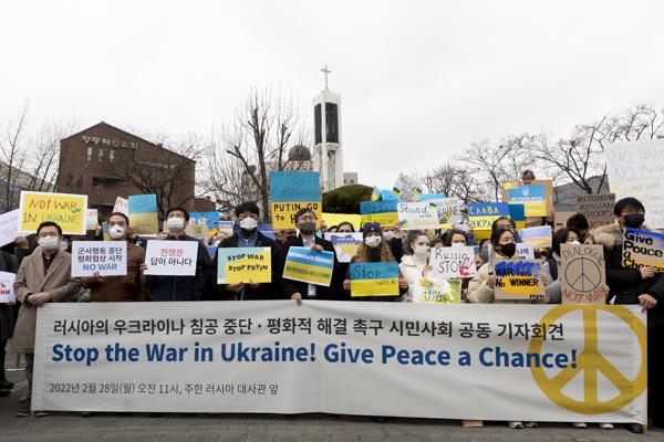국내 약 400개 시민사회단체, 재한 우크라이나인, 우크라이나 교민 등 시민 100여 명이 28일 서울 중구 주한 러시아대사관 앞에서 '러시아의 우크라이나 침공 중단 평화적 해결'을 촉구하는 시위를 벌이고 있다.