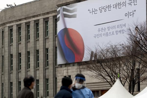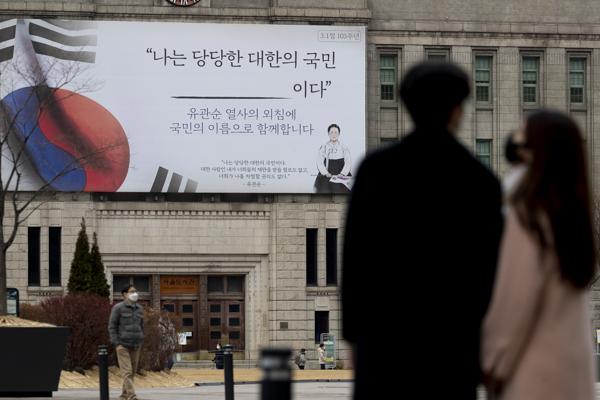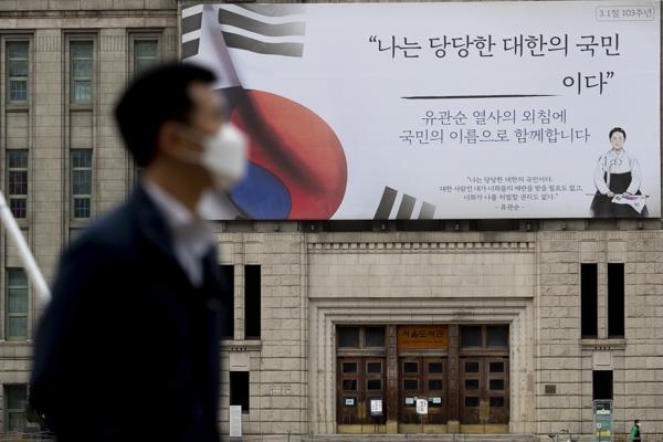 3·1절을 하루 앞둔 28일 서울시청 서울도서관 외벽 꿈새김판에 유관순 열사의 외침 "나는 당당한 대한의 국민 _이다"가 게시돼 있다.