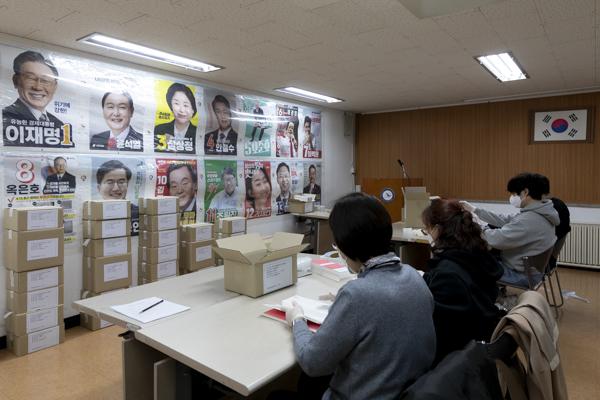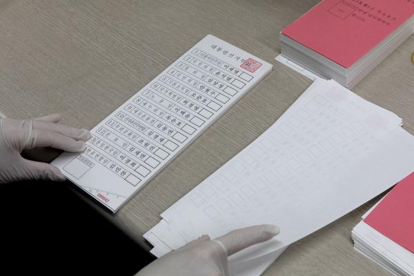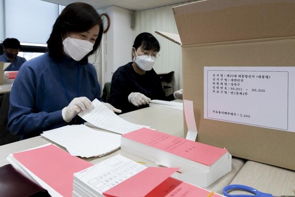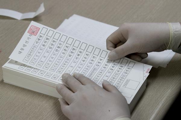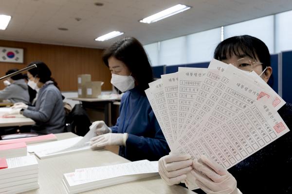 제20대 대통령 선거를 6일 앞둔 3일 서울 강북구선거관리위원회 관계자들이 9일 본투표에 사용될 투표 용지를 검수하고 있다. 잇따라 후보직 사퇴 의사를 밝힌 새로운물결 김동연 후보와 국민의당 안철수 후보는 4, 5일 진행되는 사전투표용지 이름 옆에 '사퇴' 문구가 들어간다. 본 투표일인 9일에는 용지에 사퇴 문구 없이 '후보 사퇴 안내문'이 투소표에 부착된다.