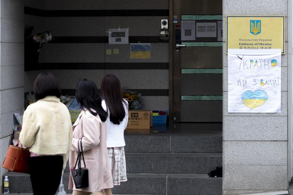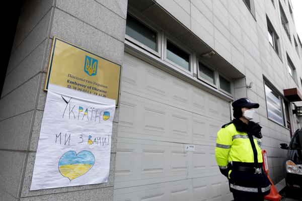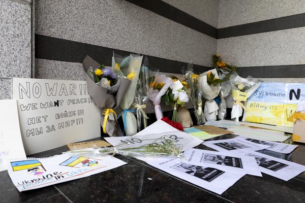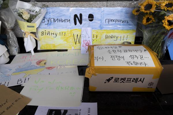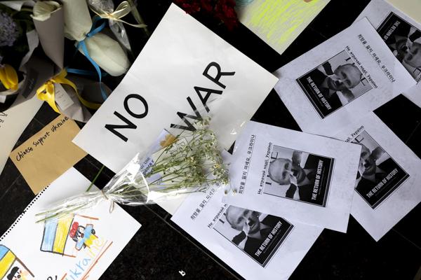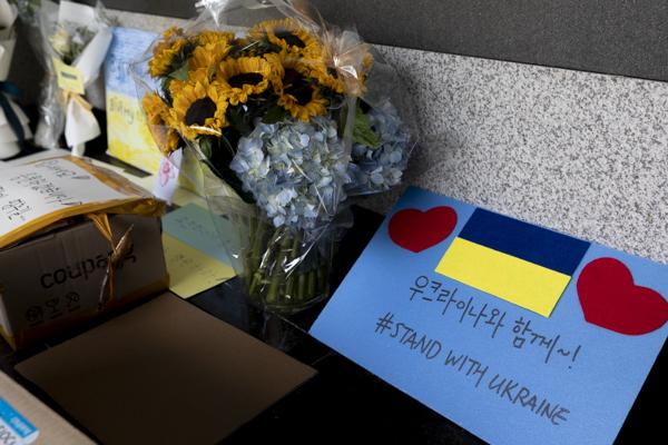 러시아의 우크라이나 침공이 2주째로 접어든 가운데 4일 서울 용산구 주한 우크라이나 대사관 입구에 시민들과 재한 우크라이나인들이 쓴 응원 메시지와 꽃다발이 놓여 있다.