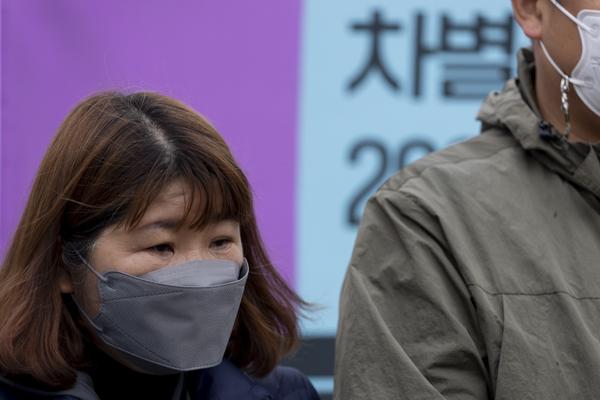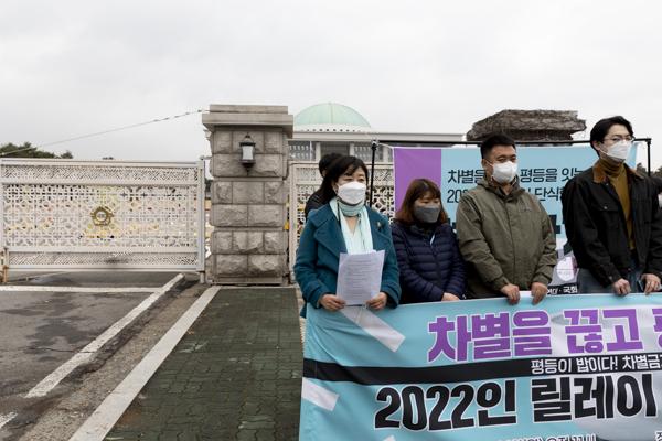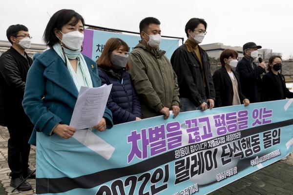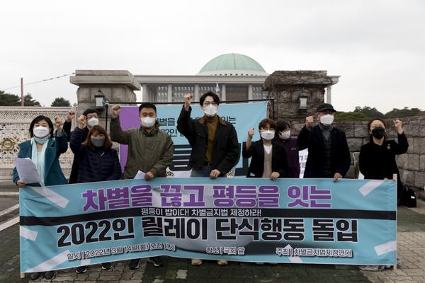 차별금지법제정연대 관계자들이 14일 국회 앞에서 '차별을 끊고 평등을 잇는 2022인 릴레이 단식행동 돌입' 기자회견 중 구호를 외치고 있다.