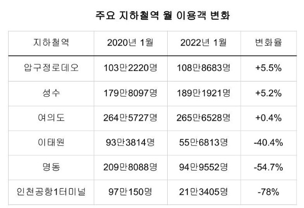 주요 지하철역 유동인구 감소 폭은 더 컸다. 올해 1월 월간 이용객 100만 명 이상인 90개역 총 이용인원은 1억4025만4279명으로 2년 전인 2020년 1월(1억7878만7514명)보다 27%(3853만3235명) 줄었다.