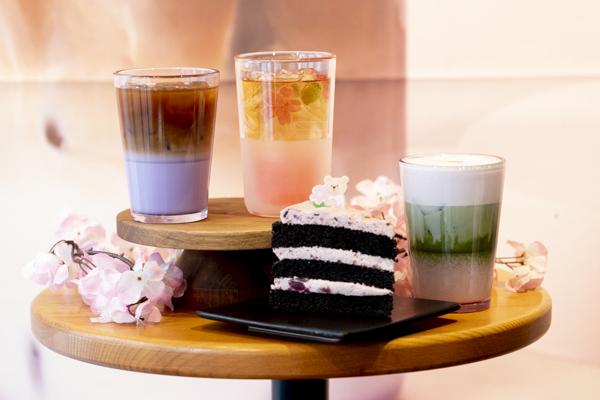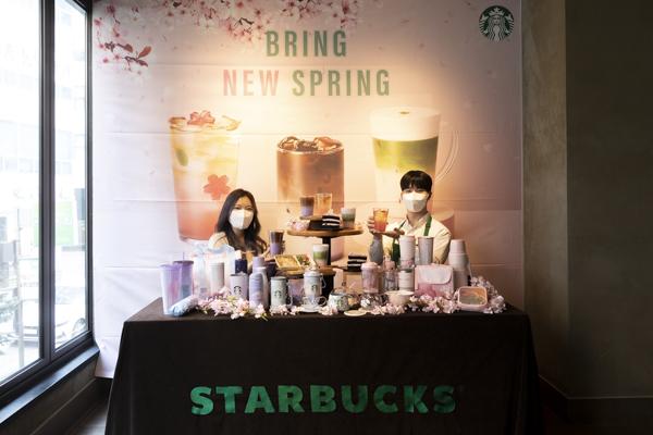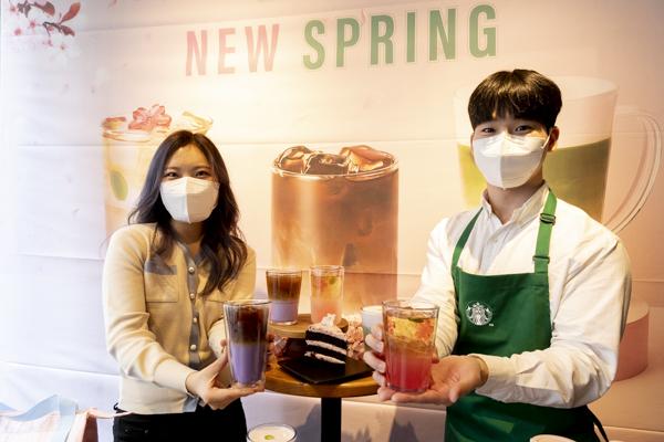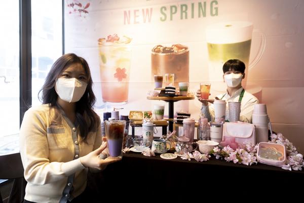 21일 서울 중구 스타벅스 한국프레스센터점에서 모델들이 '미드나잇 베르가못 콜드 브루'를 비롯한 새로운 벚꽃 시즌 음료와 푸드, MD 상품 등을 소개하고 있다.