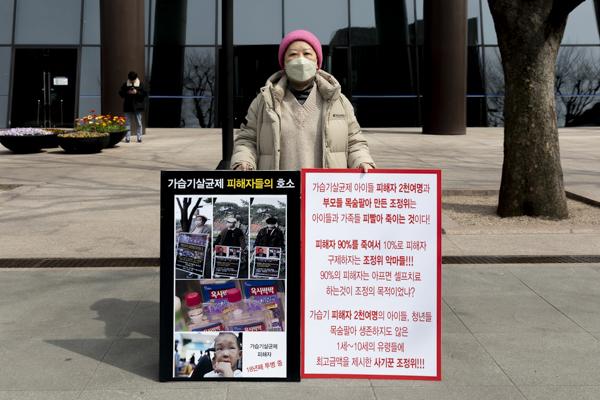 사진은 가습기 살균제 피해자이자 가족인 박수진 씨가 21일 서울 종로구 교보생명빌딩 앞에서 '가습기 살균제 참사 11년 정부·가해기업·조정위 규탄' 1인 시위를 하고 있는 모습.