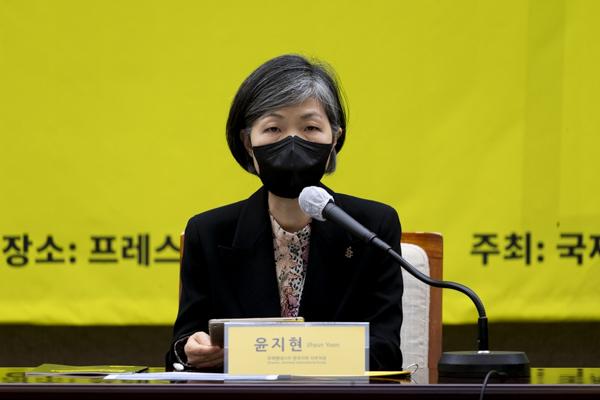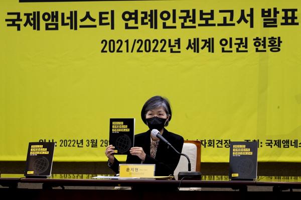 윤지현 국제앰네스티 한국지부 사무처장이 29일 서울 중구 한국프레스센터에서 열린 '국제앰네스티 2021/2022 연례인권보고서 기자회견'에 참석해 인사말을 하고 있다.