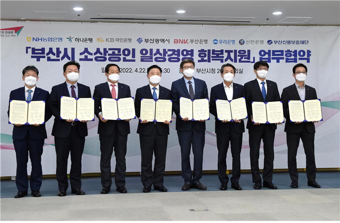 부산시는 지난 22일 부산신용보증재단, 시중은행 6곳과 '소상공인 일상경영 회복지원 업무협약'을 체결했다고 24일 밝혔다. 해당 은행 6곳은 부산·국민·우리·하나·신한·농협 등이다.