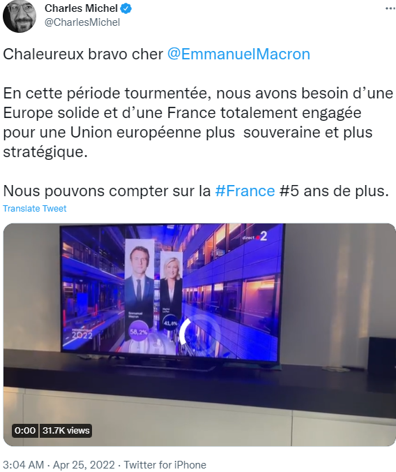 샤를 미셸(Charles Michel) 유럽이사회 의장은 맨 먼저 트위터에 대선 결과를 전하고 "브라보 엠마누엘"이라고 축하하며 "이 고통스러운 시기에 우리는 강력한 유럽과 더 주권적이고 전략적인 유럽연합을 위해 완전히 헌신하는 프랑스가 필요하다"고 말했다.