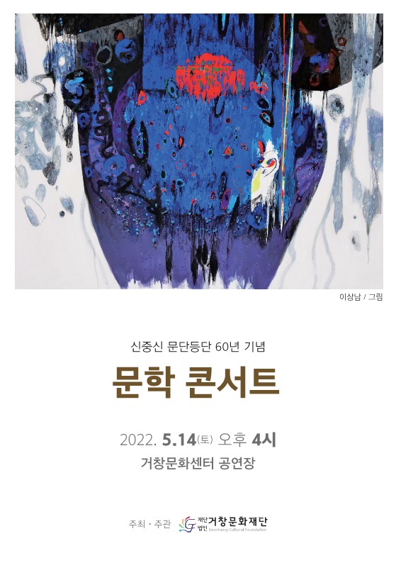 전시 마지막 날인 5월 14일 오후 4시 거창문화센터 공연장에서 열리는 문학콘서트에서는 신중신 시인이 문학 입문계기, 시인의 작품세계, 향후 계획 등을 밝힌다.