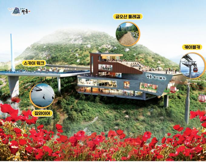 '하동 플라이웨이 케이블카'는 해발 849m의 금오산 정상에서 금남면 중평리 청소년수련원 일원에 이르는 총연장 2.5㎞의 선로를 자랑한다. 프랑스 포마(POMA)사의 최신식 10인승 캐빈 40대는 시간당 1200명, 하루 최대 9800명을 태울 수 있다.