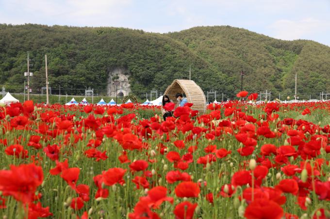 올해 꽃양귀비 작황은 예년 못지않게 화려하다. 적색과 분홍의 꽃양귀비를 비롯해 노란 유채, 자색의 보라유채, 하얀 안개꽃 등 5색의 꽃밭이 더욱 화려한 자태를 뽐내고 있다.