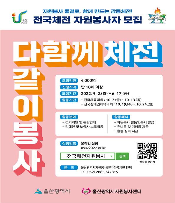 울산시 관계자는 "전국(장애인)체육대회를 치르기 위해서는 하루 평균 1500~2500명의 자원봉사 인력이 필요하고 그 역할도 크다. 성공체전의 주역이 될 자원봉사자 모집에 많은 분의 지원을 바란다"고 전했다.