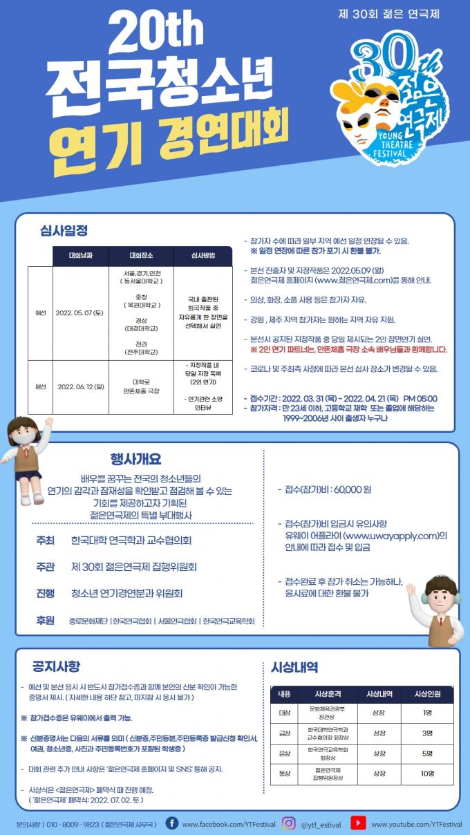 이날 예선전 연기는 국내 출판된 희곡 작품 중 한 장면을 선택해 실연하면 되며 본선은 내달 12일 서울 대학로 안똔체홉 극장에서 열리게 되낟. 대상1명, 금상3명, 은상 5명, 동상 10명 등 총 19명의 청소년 연기왕을 선발하게 된다.