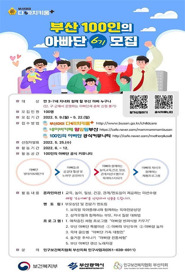 '100인의 부산 아빠단'은 다음 달 발대식을 시작으로 연말까지 육아와 관련한 다양한 체험활동을 수행하게 된다. 부산시는 12월 말에는 연간 우수활동 아빠를 선정해 별도 시상할 계획이다.