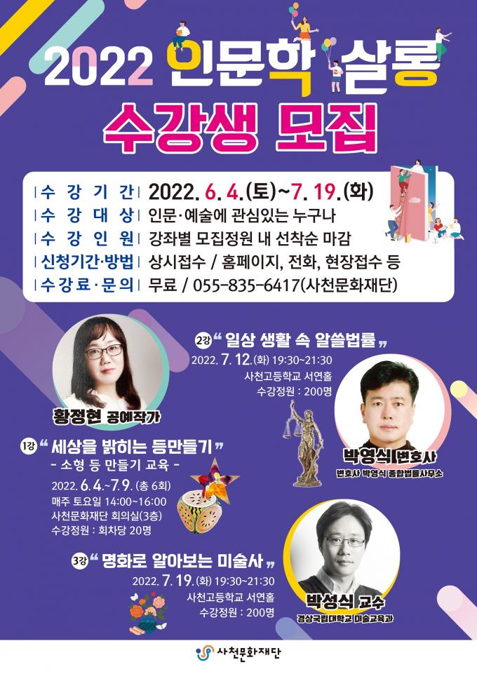 사천문화재단(대표이사 강의태)은 시민들의 인문 소양 함양과 교육·지적 욕구를 충족시키기 위해 '인문학살롱' 수강생을 모집한다.