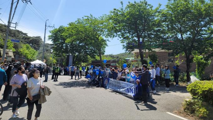 마을 입구 곳곳에는 '문 대통령님, 이웃이 되어 반갑습니다'라고 적힌 플래카드가 나붙었고, 평산마을 회관 앞에는 100여 명의 지지자들이 일찌감치 자리를 앞다퉈 차지, 문 전 대통령 부부의 도착을 기다렸다.