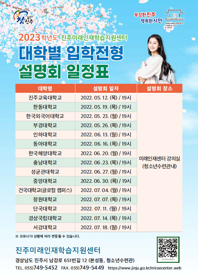 진주미래인재학습지원센터는 12일부터 학부모 및 고등학생을 대상으로 '2023학년도 대학별 입학전형 설명회'를 개최한다.