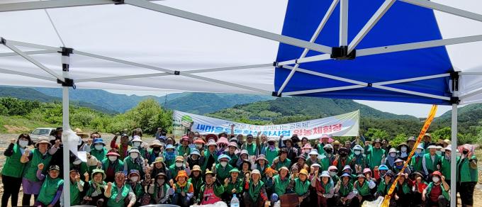 이날 조명환 회장, 차재권 협의회장, 김욱점 부녀회장, 맹중철 문고회장을 비롯해 각 읍면 새마을지도자 등 120여 명은 이른 아침부터 모여 20㎏들이 상자 약 40박스 분량의 고구마 모종을 식재했다.