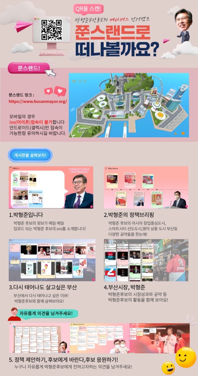 또 시민이 자유롭게 의견을 남길 수 있는 △정책 제안하기 △후보에게 바란다 △박형준 응원하기 등을 운영하면서 시민과 소통하는 채널로 활용된다.