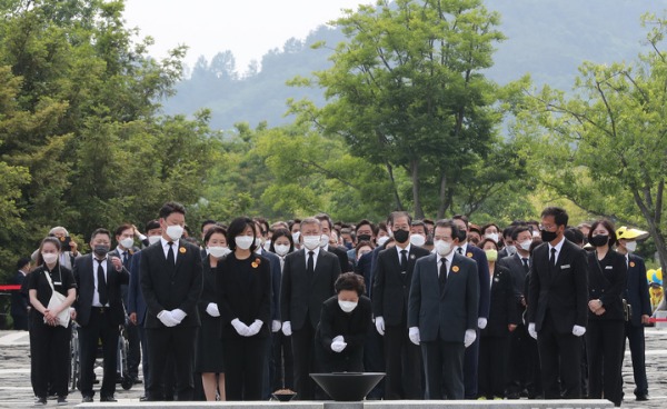추모제를 마친 후 문 전 대통령 등 참석자들은 대통령 묘역에 헌화 참배했다. 이날 민주당에서는 윤호중·박지현 공동비상대책위원장을 비롯해 박홍근 원내대표, 이재명 총괄선거대책위원장 등 지도부와 당 소속 의원들이 대거 참석했다. 이해찬·이낙연 전 대표와 한명숙 전 총리, 문희상 전 국회의장 등 민주당 원로 인사들도 함께했다.