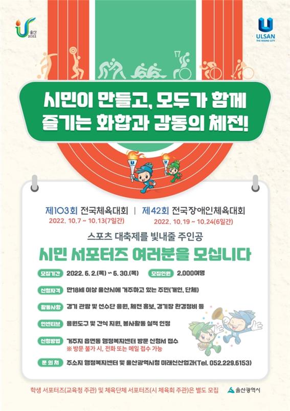 울산시 전국체전기획단은 시민 응원단 활동 지원을 위해 홍보 기념품과 응원도구, 간식 등을 제공한다. 대회 종료 후에는 우수 응원단(서포터즈)을 선정해 시장 표창도 수여할 계획이다.