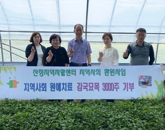 산청지역자활센터는 지역문화예술단체인 극단 '큰들'과 50인 이상 거주 사회복지시설에 감국 묘목 3000주를 전달했다.