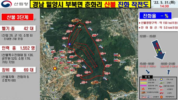 산림청은 산불진화헬기 42대(산림 26대, 국방 10대, 소방 6대)와 인력 1552명(산불특수진화대원 등 136명, 산림공무원 520명, 소방 176명, 기타 720명)을 동원해 총력 대응하고 있다.