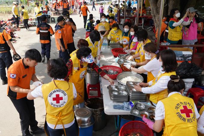 특히 현장에서는 대한적십자사, 밀양청년회의소, 지역농협, 자원봉사단체협의회 등 여러 자원봉사 단체에서 화마와 사투를 이어가고 있는 산불 진화요원들을 위해 급식을 제공하고, 구호물품을 지원하고 있다.