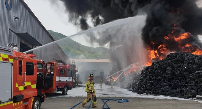 4일 오전 11시 25분께 함양군 안의면 황곡리의 한 폐타이어 재활용 공장 야적장에서 화재가 발생했다.