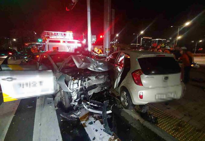 이 사고로 60대 택시 운전사와 30대 승객, 50대 경차 운전자 등 3명이 다쳐 병원으로 옮겨졌다. 경차 운전자는 중상을 입은 것으로 전해졌다.