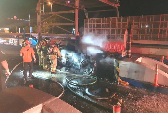 사고 차량은 전기자동차로, 소방대원들은 차량 내·외부를 소화한 뒤에도 차량 하부 리튬배터리 진화에 애를 먹었다. 진화는 전기차 주위로 이동식 침수조를 설치해 차량을 침수시키는 방법으로 이뤄졌다.
