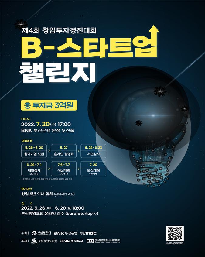 수도권 민간투자사 공동주관으로 후속 투자 유치 기회 부산시는 오는 20일까지 부산창업투자경진대회인 '2022 B-스타트업챌린지'에 참가할 전국의 유망 창업기업을 모집한다고 9일 밝혔다.