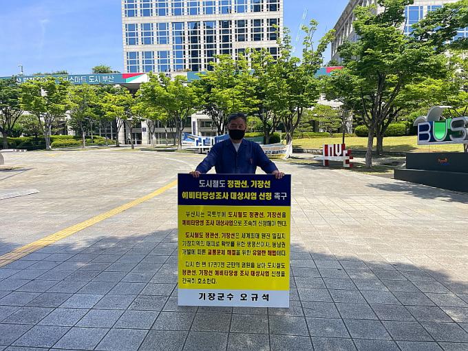 오규석 군수는 지난 3일에 이어 10일 오전 부산시청 앞에서 정관선·기장선의 예비타당성 조사 대상사업 선정을 촉구하는 1인 시위를 벌였다.