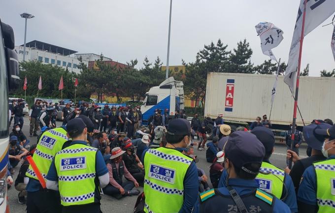 경찰에 따르면 이날 화물연대 노조원 270여 명은 한개 방향 도로를 완전 점거한 채 연좌 농성을 벌이며, 화물차량 운송을 방해했다.