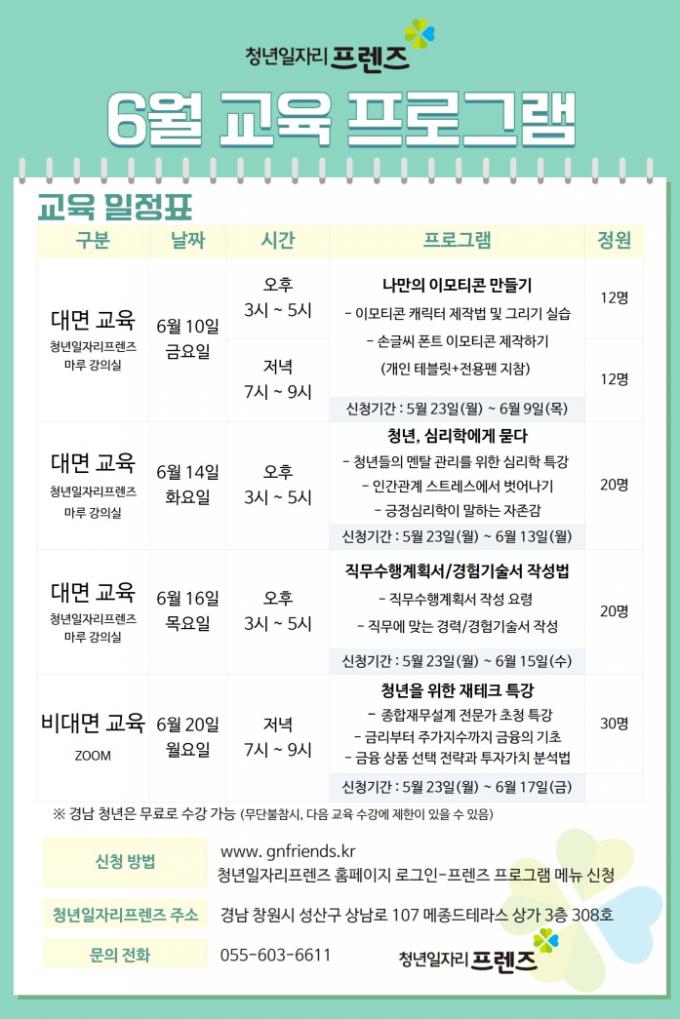 교육 프로그램은 나만의 이모티콘 만들기(창업·10일)를 비롯해 직무수행계획서 작성법(취업·14일), 청년 대상 심리학 특강(마음건강·16일), 청년이 꼭 알아야 할 재테크 특강(투자·20일) 등 다양한 내용으로 짜여졌다.