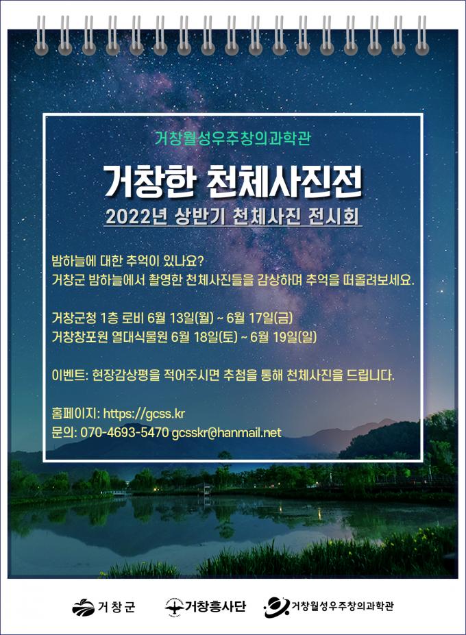 올해 상반기 행사인 '거창한 천체사진전'은 청정지역에서 볼 수 있는 다양한 천체들과 천문현상들을 담은 사진들을 선보인다. '거창창포원 밤하늘을 담다'에서 입상한 작품들도 다수 포함돼 있다.