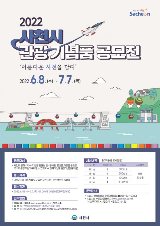 응모대상은 사천의 문화·역사·자연을 활용한 민·공예품, 공산품, 가공품 등이다. 국내외 관광객들이 구매할 수 있고 지속 판매 가능한 관광기념품이다.