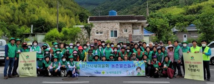 양산시 새마을회 및 부녀회가 합동으로 원동면 내포·영포마을 소재 농가를 찾아 턱없이 부족한 농촌 일손을 돕기 위해 나섰다.