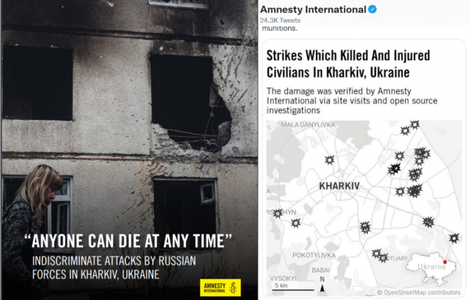 앰네스티 조사단은 하르키우에서 지난 4~5월 2주에 걸쳐 최소 62명이 사망하고 196명이 다친 41건의 공습 사례를 조사하고 160명의 생존자와 유족, 목격자, 의사 등을 인터뷰했다.