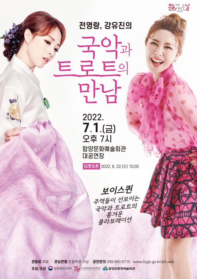 함양군은 7월 1일 오후 7시 문화예술회관 대공연장에서 '국악과 트로트의 만남'이라는 주제로 콘서트를 개최한다.