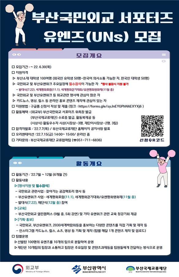 서류심사를 거쳐 최종 선발된 '유엔즈'는 다음 달 22일 발대식을 시작으로 올해 말까지 약 6개월간 활동한다. 참여 대상은 국민외교 및 부산유엔위크 등 외교 관련 행사에 관심이 많은 부산지역 대학생과 외국인 유학생이다.