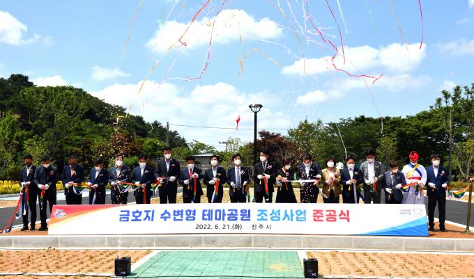118억 들여 어린이 물놀이터 등 갖춰 경남 진주시는 21일 금산면 장사리 금호지에서 수변형 테마공원 조성사업 준공식을 열었다.