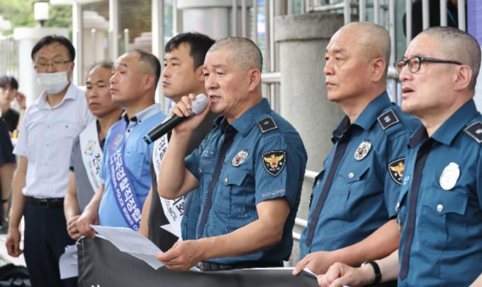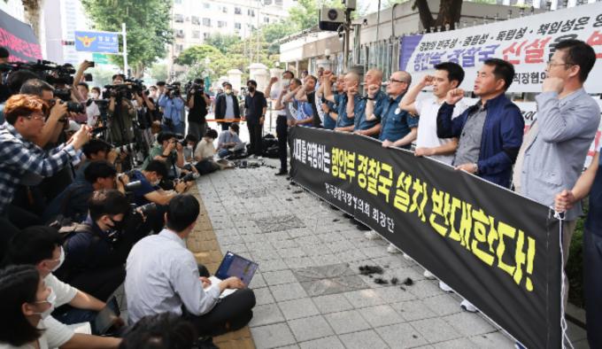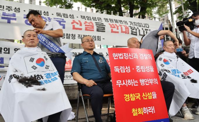 지난 4일 오전 서울 서대문구 경찰청 앞에서 민관기 청주흥덕경찰서 직장협의회장등이 행정안전부 경찰국 설치를 반대하며 경찰 77년 역사상 처음으로 단체 삭발을 한 뒤 참석자들과 함께 구호를 외치고 있다.